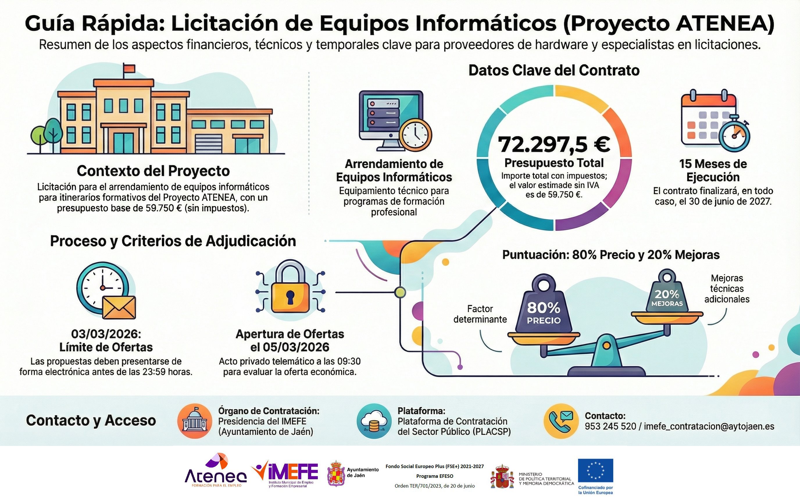 Suministro en régimen de arrendamiento de equipos informáticos en el ámbito del Proyecto "ATENEA", en el marco del Programa de Empleo, Educación, Formación y Economía Social (EFESO), del Fondo Social Europeo Plus (FSE+), en el período de programación 2021 - 2027, organizadas por el Instituto Municipal de Empleo y Formación Empresarial del Excmo. Ayuntamiento de Jaén.